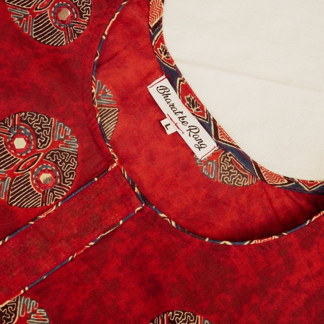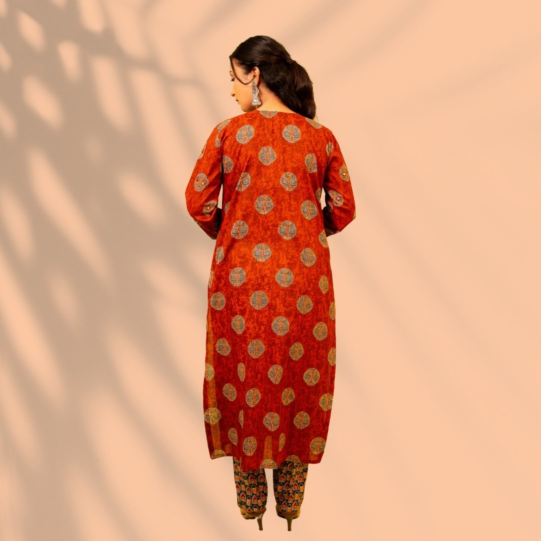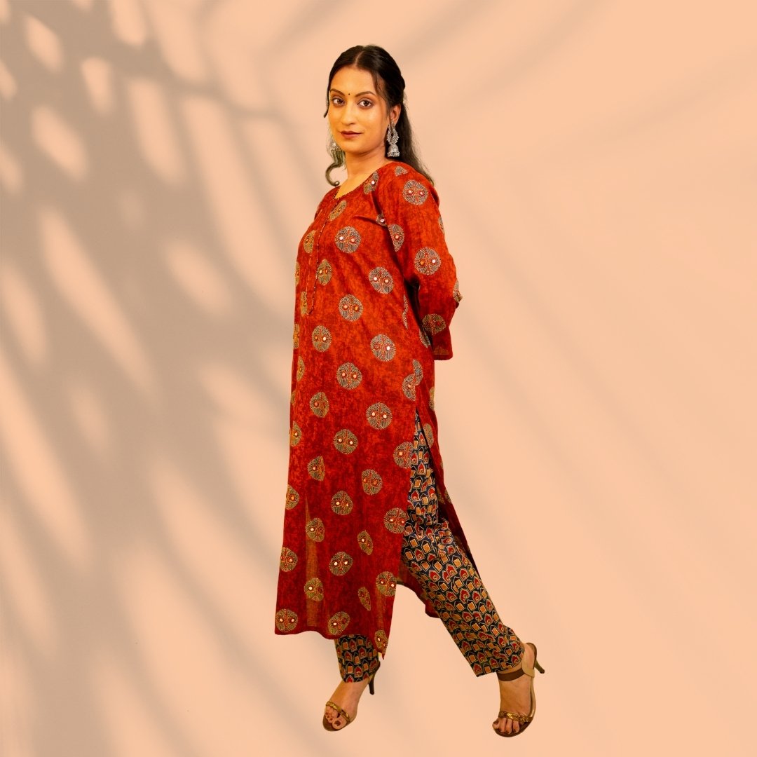 This rust and blue cotton suit is adorned with delicate mirror work, blending traditional charm with breathable comfort. Lightweight, vibrant, and effortlessly elegant.