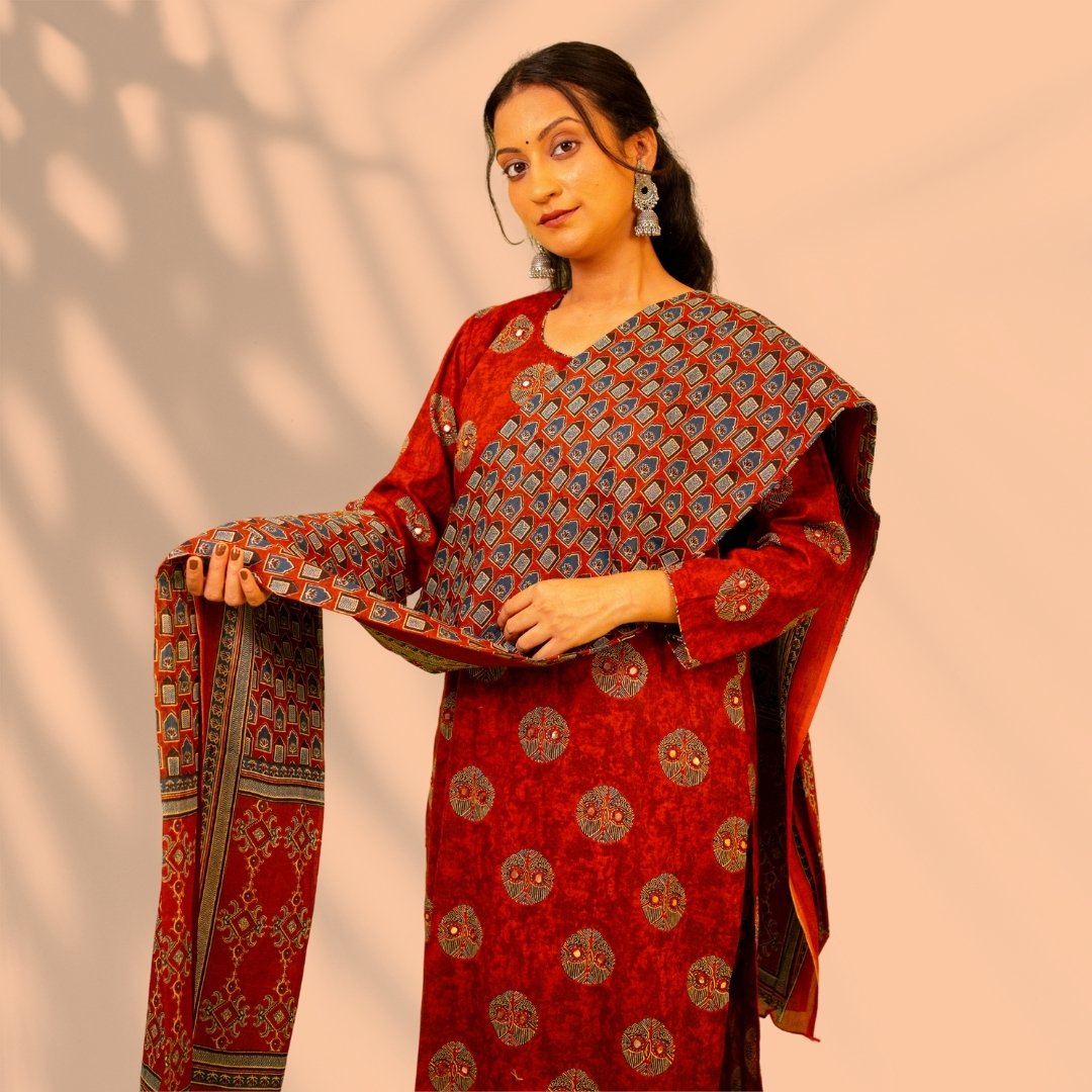 Crafted from soft, breathable cotton, this rust and blue suit features intricate mirror embellishments that add a subtle sparkle and festive appeal. The combination of warm rust and cool blue tones creates a striking yet balanced look, perfect for casual gatherings, daytime celebrations, or cultural events. Its lightweight texture ensures all-day comfort. Pair it with understated accessories and neutral footwear to highlight the suit’s vibrant colors and reflective details.