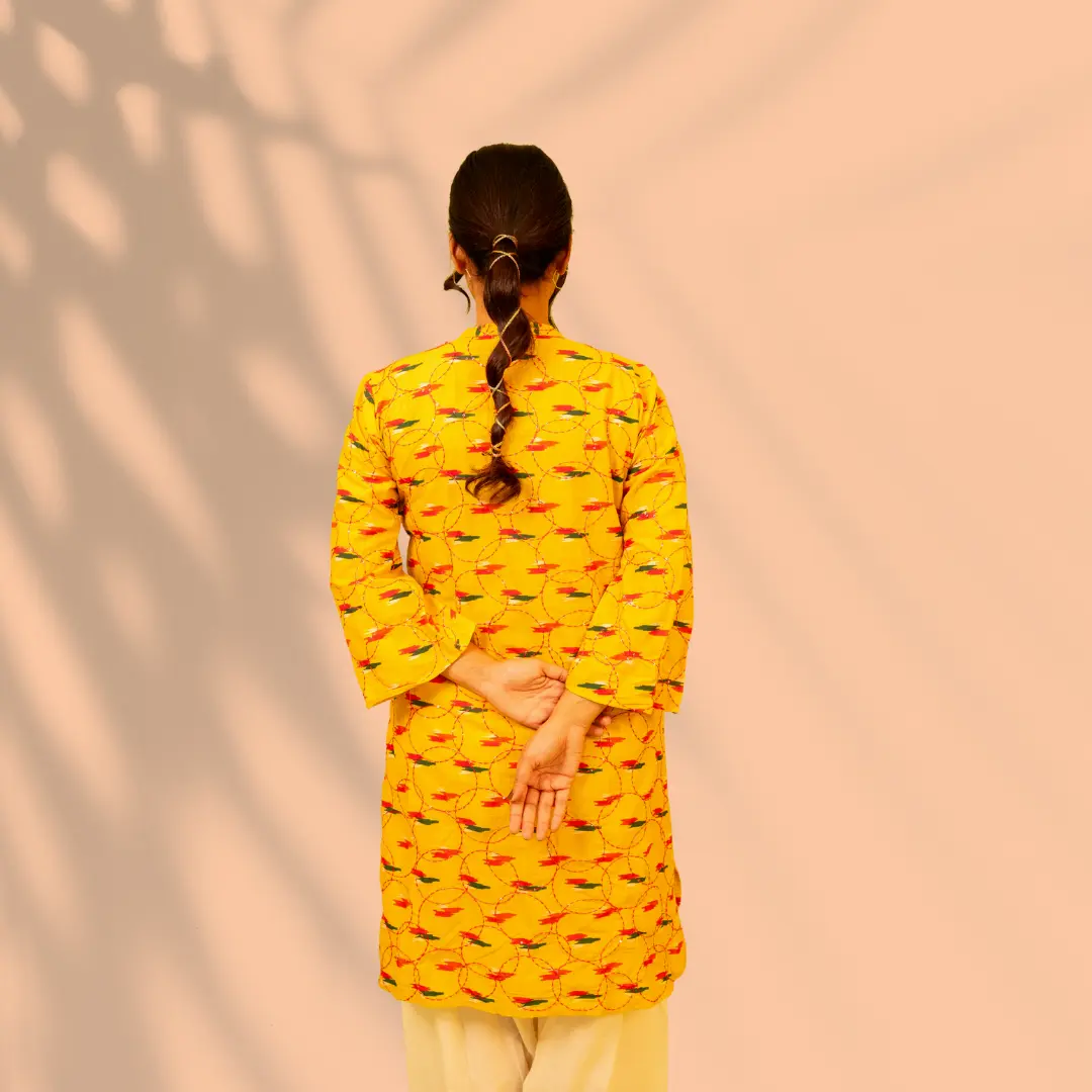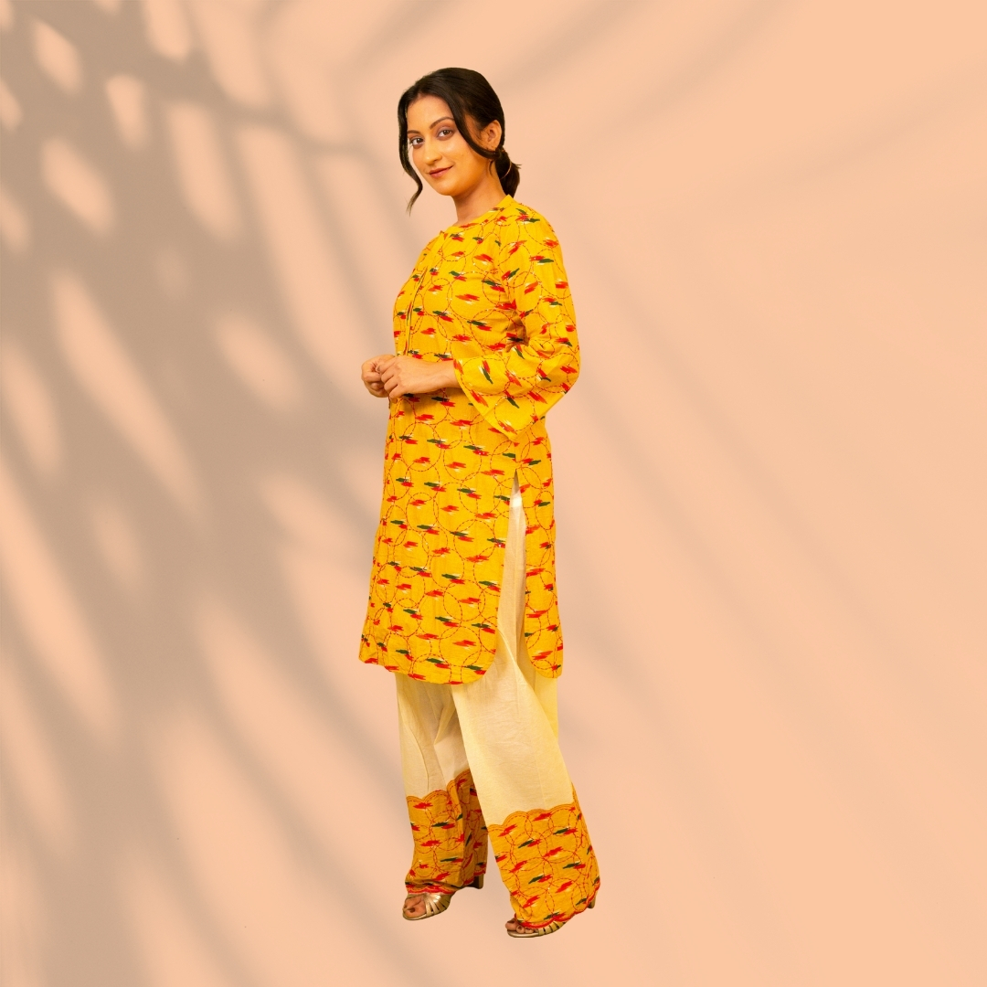 Made from pure cotton, this yellow co-ord set ensures all-day comfort with its airy, soft texture. The matching set design offers a polished, put-together look while keeping it casual and relaxed. Its sunny yellow hue adds a vibrant touch, perfect for day outings, brunches, or casual gatherings. Pair it with neutral sandals or white sneakers to complete a fresh, lively ensemble.